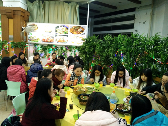 聚餐伊始,大家先相互举杯祝福,然后便开始品尝每一道菜,席间大家说说笑笑,时时发出愉快的笑声,空气中荡漾着轻松的氛围。大家有的谈论最近校园里发生的事情,有的感叹一下变化多端的天气,有的咂着嘴赞美起美味的佳肴……总之场面十分热闹!