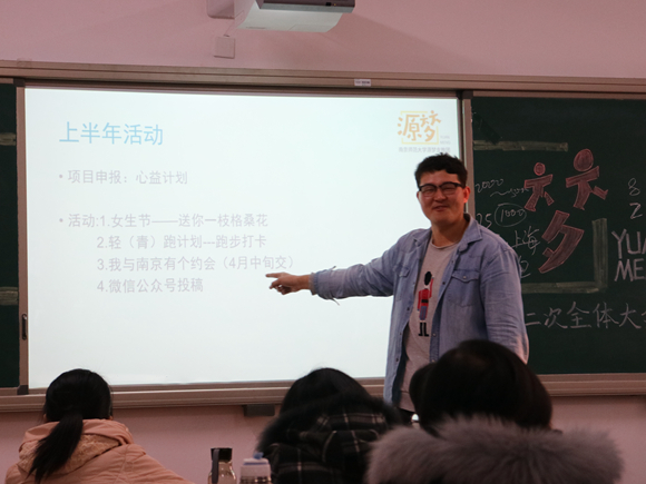 本次会议主要分为4个部分:项目申报问题讲解,近期活动介绍,待解决问题商讨,社员疑问解答。首先项目部部长张凯为社团成员们介绍了本社团近期的申报活动:心益计划。接着,王宁为大家介绍了正在进行中的“轻(青)跑计划”活动以及近期将举行的“女生节,送你一朵格桑花”、“我与南京有个约会”等活动 。其次,王宁对社团内部的教材编写提出了修改意见,并解答了社员们关于支教活动的疑问,鼓励支教团成员们“不忘初心,方得始终”。内容介绍完毕后,各个部门就三月份即将开展的女生节活动分领了任务并展开了高效的讨论以进一步准备工作。