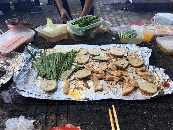 接着,同学们抵达野营俱乐部开始自助烧烤。一开始,同学们遇到了困难:生火难。缺乏经验加上不时的阵风让同学们有点不知所措。但大家很快调整了方案,有的站在上风处挡风,有的找来了石蜡跟酒精,有的则自告奋勇点火。在大家的一致努力下,火终于生起来了。同学们也顺利开始了烧烤。烧烤过程中,同学们相处融洽,配合默契,俨然一个磨合已久的专业团队。虽然条件略显简陋,但同学们却乐在其中。野营地周围洋溢着同学们的欢声笑语。