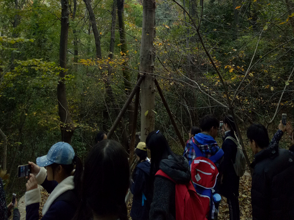 首先,宝华山植被类型主要是暖温带落叶阔叶林。其次,由于是秋天,看到的大多是“彩叶树”,比较典型的有三角枫(槭树科),落叶树如榆科的榆树,榔榆等;还有较多的常绿树卫茅(茅竹),青冈(壳斗科),这也表明了宝华山这一地区是植被“过渡区”,以落叶林为主但在优良的水热条件下也有常绿树。再者是在近山顶的广场“百福园”,老师带领我们辨识了一些人工种植的植物,并告诉我们这些植物在南师大的校园里也很常见,主要有红叶石楠(叶片红绿交杂),鸡爪槭等常绿灌木,匍匐龙柏以及木犀科的桂花,常见树种香樟等,同学们对有些树种比较熟悉,能够辨识,但大多还是不能立刻说出名字。大家很认真地听老师对植物如何辨识的介绍,并且引导我们可以留心校园里的植物,加深“认植物”的体会。