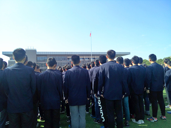 按照惯例,各班有序进入操场以后,由国旗班护送着国旗迎旗入场,在庄严的国歌声中,全体肃立,行注目礼,注视着国旗冉冉升起。