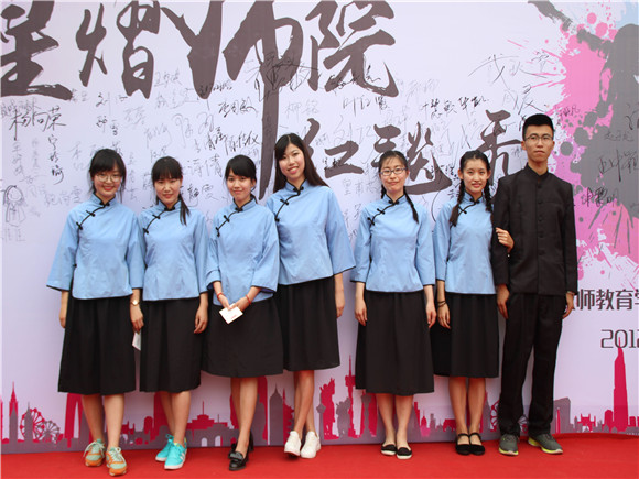 下午五时,红毯秀正式开始。首先走上红毯的,是此次活动的工作人员。每场活动的成功举办都离不开工作人员的辛勤付出,在他们签名结束后,各班的节目代表开始陆续走上红毯。谈古说今的历史师范、青春靓丽的英语师范、根正苗红的思政师范…每个班级都展示着自己的班服特色,也让大家深深的感受到师院学子昂扬的精神面貌。随后进行的服装秀将整场红毯秀拉向了高潮,亭亭玉立、青春娇小的“民国少女”与美目嫣然、顾盼生姿的“雍容贵妃”走上红毯,引得在场观众连连尖叫。