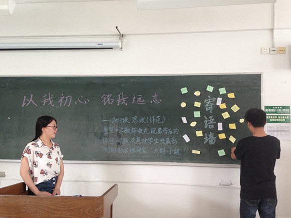 思想政治教育师范专业的大学生创新创业训练计划“聚焦中学教师收礼现象背后的师德问题及其对学生发展影响的社会性研究”项目小组开展了“以我初心,铭我远志——写给未来的老师”寄语墙活动,小组成员有楼钘、李心怡、朱昊、张华光、斯涵妮。