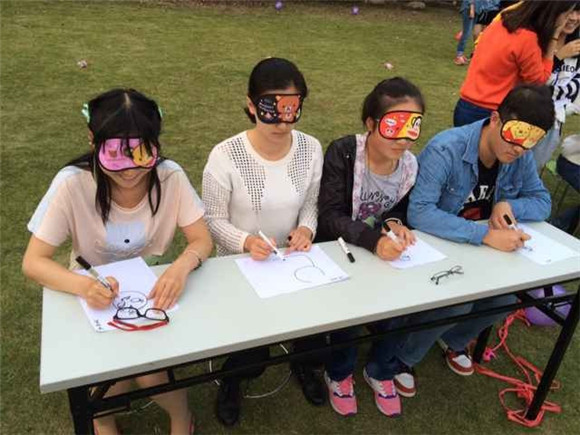 经过前两轮体力的比拼,第三环节迎来脑力的大战:蒙眼作画。记忆画面时,有的小组三个人分工配合,将整幅图肢解记忆;有的小组则选择三个人分别记忆。3分钟后开始描述,同学们各出奇招,有的仔细描述,有的绘声绘色,使用各种手势,还有的甚至摆出肢体动作。画画容易,蒙眼作画难。被蒙住眼睛的同学凭借直觉绘画,3分钟后呈现在我们面前的是一幅幅“师”界名画。原本我们年少时期心中的英雄奥特曼被画成机器猫的样子。对比两幅图,观看者笑得前仰后合,也将全场的气氛推到高潮。作为最考验默契度的环节,压轴的是乒乓球默契大考验。第一位同学用鼻子和上嘴唇叼吸管给第二个人,再吸乒乓球给第三个,他接到球后用乒乓球拍托球走,最后一个人接到球后原地转10圈,并把球放入容器。四个步骤,四个高难度的动作,特别需要团队的配合,但在一个宿舍的同学面前一切都迎刃而解了。