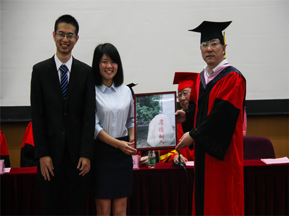 为激励师院毕业生学子奔赴新的岗位,祝贺他们开启新的征程,学院向每位毕业生赠送了钢笔作为毕业礼物,希望同学们能以生花妙笔书写锦绣人生。投我以木桃,报之以琼瑶。心怀无限感恩的毕业生亦向学院赠送了镌刻有“厚德树人”字样的校友纪念石,该石安放于化成楼北侧,不但表达了2015届毕业生对学院、老师们的感恩,更展示出我校师范精神的代代传承。时光荏苒,岩石会剥蚀,证书会褪色,但这一满溢师生情谊的时刻却将永远定格在场的每个人心中。