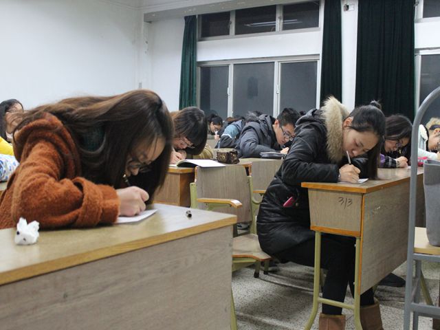 学生会大学生发展中心的所有成员就已早早到场,开始了紧锣密鼓的准备。精美的海报、工整的板书和悠扬的音乐烘托出现场古典雅致的气氛。晚六点整,汉字书写大赛团体赛正式开始。本场比赛场地分为四块,其中三块按照年级划分,为硬笔字比赛场地,另一块为粉笔字比赛场地。此时大一、大二和大三的同学们已齐聚在候场区,个个摩拳擦掌、跃跃欲试。因此,寒冷的天气并没有削减同学们参与比赛的热情,反而烘托出了现场浓烈的比赛气氛。首先,在主持人宣布完比赛规则后,各位参赛选手便坐下开始写字。选手们的字或圆润或瘦削,可谓是挥毫泼墨、收放自如,由此足可见高手云集、群贤毕至。然后,比赛进入紧张的倒计时阶段,参赛选手们却是沉着冷静、埋头书写,展现出他们的磅礴大气。最后,经过钢笔字和粉笔字两轮角逐,比赛已接近尾声。目前,本场比赛已进入了评分阶段,最终结果将在近期公布,请大家拭目以待。