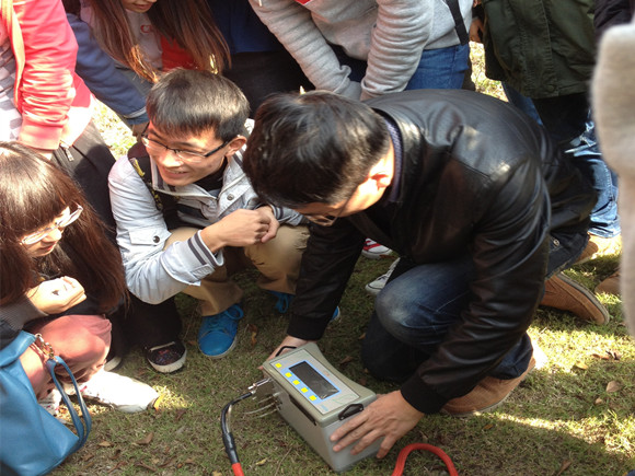 之后,商志远老师教我们先测量现在所在点的经纬度、高程、湿度和温度。随后,我们分小组分别测量两片不同树叶的光合作用速率。第一组由谢盈盈同学和张荣荣同学担任主要操作员,她们将小山坡上一棵比较大,比较绿的树木的叶片放进光合速率器的弧形叶室中,然后将叶片夹紧,由另外的一些同学对仪器显示屏部分进行校准调节,以确保正确的数据读取。在操作过程中最主要的是要保证叶片不能被摘下来,这是本次实验成功的关键。2—3分钟后可以开始读取数据,其中有光合速率参数和表示叶片气孔张开程度的参数。第二组主要由张晨同学和高慧同学担任操作员。第二组与第一组的主要区别是第二组的同学选择了一片红色的年龄较老的树叶作为实验品,其他的操作与第一组基本一样。这样我们就可以根据两组的测量数据来分析植物光合作用的影响因素。完成操作和数据读取之后,大家各抒己见,讨论自己对光合作用的认识。最后,校园实习在老师和同学们的讨论声中结束了。