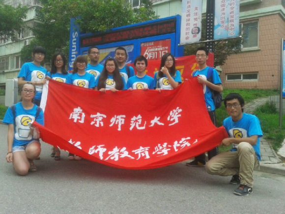 下午三点,在队长程庆保的带领下,全队11人抵达了翠林山庄。首先在翠林山庄的正门处挂起了内容为“放飞儿童梦,彩虹社区行”的横幅,这是本次社会实践活动的口号,也是“彩虹“分队的新浪微博名。之后,小组成员开始向过往的孩子以及家长发放宣传单,向家长和孩子们讲解本次活动的详细内容以及课程计划,并向孩子家长们征求暑假开课的意见,孩子们也表现出强烈的兴趣。很多小朋友在报名点报名后,纷纷邀请自己的好朋友也来报名参加此次暑期趣味课堂活动。