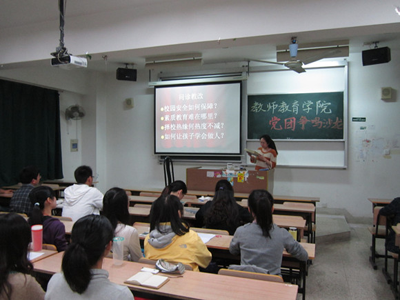 随后,大家以分团委、预备党员和党总支为小组,针对当下的时政热点——教改,展开了激烈讨论,现场气氛热烈。小组讨论主要围绕四个问题展开:校园安全如何保障、素质教育难在哪里、择校热缘何热度不减、如何让孩子学会做人。接着,各小组选取一个问题,派出一名代表上台交流本小组的观点看法。各小组的交流热点主要集中在素质教育、择校热等方面,大家普遍认为这些有关教育的社会问题的解决,应从学校、家长以及学生自身等各方面采取措施,希望教改能真正落实到位。