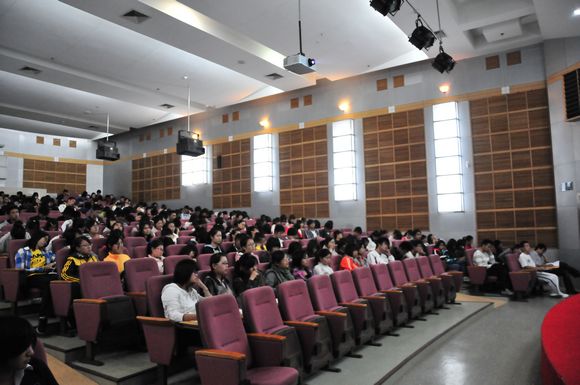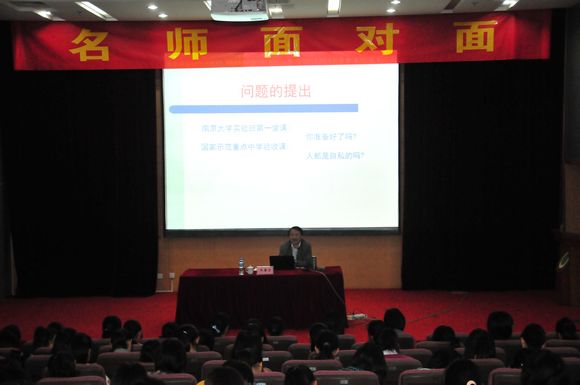 第二场讲座于下午一点半准时开始,主讲人是金陵中学的另一位特级教师朱建廉老师,他讲座的主要内容是“教师职业感悟”。首先,他从教育理论对教育的定义出发,引出了他的教师职业观,教师不仅是谋生的手段,更应把它当做值得终身追求和为之奋斗的事业,从而获得一种幸福感。此时场下掌声一片,同学们都与之产生了共鸣。然后,他回顾了自己作为一名特级教师的成长历程,与同学们分享了他从业生涯中的几个小故事,诙谐幽默,深入浅出,使同学们更加切身地体会到名师是如何炼成的:教师从入门到成熟需要经历一个较为漫长的成长过程,需要不断积累教学经验,精益求精,同时需要耐心细致的工作态度,严谨踏实的工作作风,更需要用心去教学。整场讲座高潮迭起,掌声此起彼伏。