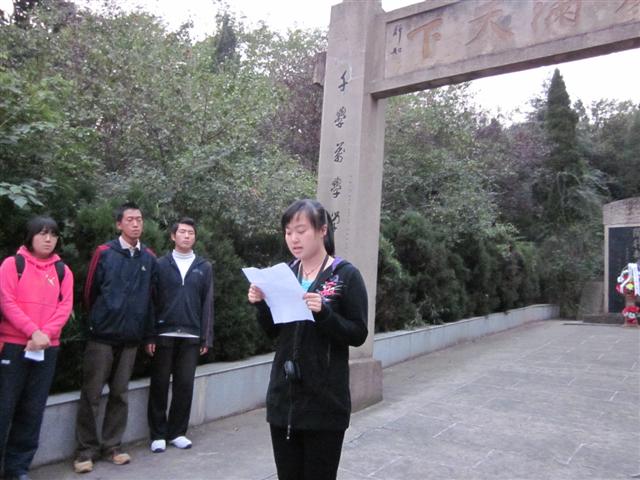 随后,在工作人员的带领下,同学们又参观了位于纪念馆西南侧的陶行知墓,牌坊高5米,宽4米,坊额刻有陶行知手迹:“爱满天下”;坊柱联语为郭沫若书写的陶行知遗教:“千教万教教人求真,千学万学学做真人”。在陶行知墓前,同学们表情肃穆庄重,同学代表在墓前献花并发言,表达了对陶先生的敬仰和无限缅怀。