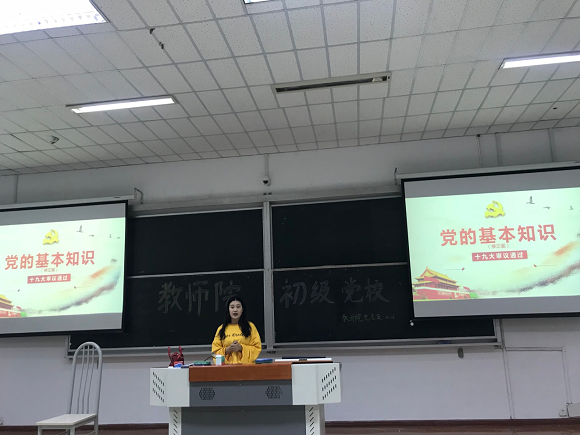 第九期初级党校培训班的第一次课程于南师大仙林校区学明楼402成功举办,由教学教育学院高小月老师向同学们介绍了党的历史。当晚的课程也正式拉开了本次初级党校培训班的序幕。本次培训共设置五次课程,其中讲授四次,考核一次。培训采用教授、互动、纪录片观看等形式,主要介绍了党的历史、入党动机、党章、大学生党员责任等多方面的内容。