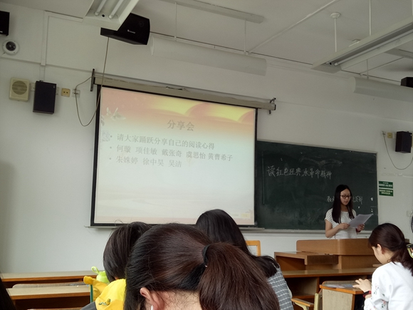 活动一开始,主持人介绍了本次会议的流程。接下来由以下八位同学依次上台分享自己阅读了红色书籍的心得与感悟。他们分别是何璇、项佳敏、戴张奇、虞思怡、黄曹希子、朱姝婷、徐中昊、吴洁。项佳敏同学分享了自己阅读完《星星之火,可以燎原》的感悟,联系了中国共产党史,并结合自己在学生会工作的实际,谈论了一个集体中每个个体的力量与作用,只有重视群众的力量,才会有所成就。朱姝婷同学分享了自己对《南渡北归》中“南渡”一部分的阅读心得,阐述了梁启超的不凡事迹和功勋,表达了“舍小我保大我”的感受,“时势造英雄”“天下兴亡,匹夫有责”“文化需传承”等感慨都是朱姝婷同学的自己感悟,深刻精辟。分享会结束的时候,支部书记傅永超同志鼓励大家以后多多阅读红色书籍,时刻关注着提升自身党性修养。