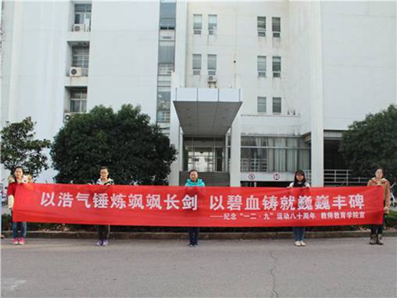 八十年前的今天,面对内忧外患的形势,一群血气方刚,充满爱国热情的青年集聚首都,举行大规模的示威游行,宣传抗日救亡精神。历史的风尘呼啸而过,八十年转瞬即逝。在这值得纪念的日子里,教师院青年学生用切实的行动、无尽的热情,书写着他们对“一二.九”爱国精神的理解和纪念:“情系一二.九”照片征集活动、“诗情画意”书画大赛、“一二.九,国之恸,师之旅”主题团日活动……不忘先贤遗志,抒发强烈的爱国主义情怀。