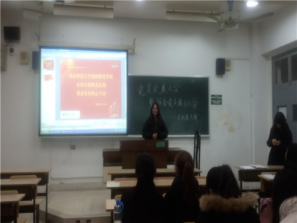 思政党支部党员发展大会暨预备党员转正大会在仙林校区学海楼318教室顺利召开。该转正大会由思政党支部书记蔡敏瑜同学主持,转正对象是钱莉、顾思卉和宋美亚三位同学,发展对象是陶然、朱和佳、黄金林和王瑞敏四位同学。