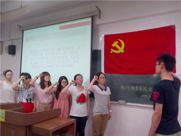 党总支在仙林校区学明楼506教室举行了庄严而隆重的学生党员宣誓仪式,本次大会由学生党总支宣传委员谢婷婷同学主持,出席本次活动的有教师院党委副书记、学生党总支书记江胜尧老师,教师院学生党总支副书记,12级辅导员孔晖老师,教师院全体预备党员及各支部的支委。