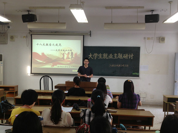 汉语言历史联合党支部选取了党的十八大报告中就业部分进行了深入研讨,首先通过案例,对大学生就业现状进行分析,接着反思自己,大家一致认为,要加强对形势政策的了解和把握,树立正确的择业观,努力提高自身综合素质,为成功就业做好思想、心理、时间、行动等各方面的准备。