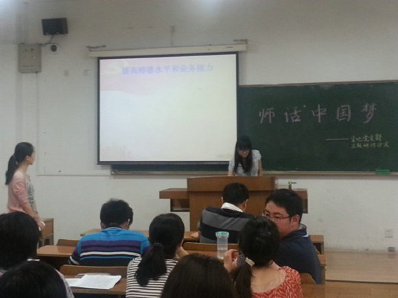 英语党支部以“我的教师梦”为出发点,将研讨会共分为三个板块——梦想篇,现实篇及梦想vs现实篇。首先大家回忆了选择师范专业的初衷以及心目中理想老师的形象,接着一场关于“应试教育与素质教育的冲突”的情景剧表演,引发了大家的激烈辩论,并提出了颇具创造性和建设性的想法,最后,以原创诗歌朗诵的形式结篇,坚定了在座同学的教师梦。余处长在高度肯定了本次研讨活动的完满成功同时,也对全体同学表达了诚挚的祝愿和期盼。
