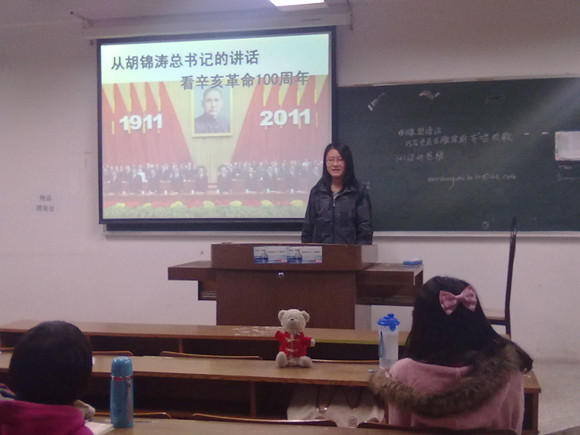 紧接着,李颖慧,谢婷婷,赵梓杉,陈秋实四位同学通过幻灯片的形式分别以辛亥革命的历史意义、辛亥革命的女英雄、辛亥革命对当今社会的积极影响以及从辛亥革命看海峡两岸关系为切入点,从各方面细致地剖析了辛亥革命。四位同学准备充分,介绍时的语言生动活泼,使各位党员对辛亥革命有了进一步认识。最后大家就辛亥革命各抒己见,畅所欲言,将心中疑团一一打破,在热烈的讨论中,会议达到高潮。