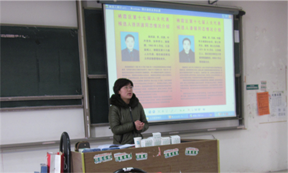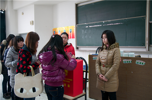 为了让选民们更好地行使当家做主的民主权利,朱老师在投票前详细介绍了选举办法及选票填写方法。随后,朱老师就戎麾、胡卫东、徐洪波、潘振等四位候选人的基本情况做介绍,并在全体同学的监督下现场检查了投票箱。选举过程秉承公正、公开的原则,选民通过无记名投票方式,对四位候选人投赞成、反对或弃权票。各位选民为选举出能代表的人民心声的区人大代表,仔细考量候选人,认真填写选票。在这此选举工作中,大部分学生选民是第一次行使自己的选举权,他们在老师及团委学生干部的帮助与组织下,有秩序地排队投票,整个投票站洋溢着民主和谐的气氛。