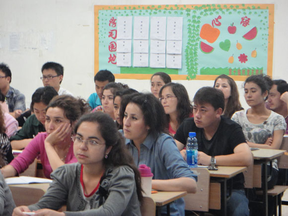 关于党的宗旨,陈老师从党的价值取向、本色、试金石三个层面论述了“全心全意为人民服务”的深刻含义,并结合党的宗旨在不同历史时期的体现以及对中学课文《纪念张思德》的回顾,形象生动地阐释了马克思主义唯物史观对党宗旨的深远影响和“为人民服务”这五个字的深刻含义。在随后介绍党在新时期的三大历史任务时,更结合了近期热门的台海关系问题和黄岩岛领土争端,感叹了祖国统一的任重道远,表达了世界和平与发展的美好愿景,充分阐释了党与时俱进的先进性和为国为民谋利益的精神。学员们都以认真的记录、及时的反馈展现着他们对这节党课的积极参与。尤其是陈老师以新疆维吾尔自治区自成立至今的经济发展历程为例讲解党的基本路线相关概念时,学员们更是侧耳倾听,频频点头回应,眼神和笑容里流露的分明是身为新疆人的自豪与油然而生的更深沉的责任感。
