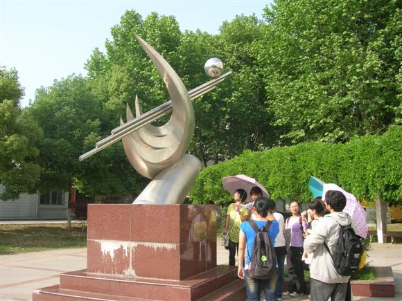 生物班和地理班的十二名中级党校成员乘车到达紫金校区后,首先在校门口集体合照留作此次出行的纪念。而后,使大家喜出望外的是,在距校门不远的地方很快找到了一个紫金校区的平面地图,地理班的同学充分发挥他们的学科优势,迅速绘制了一张简易的平面图,方便大家寻找雕塑的位置。