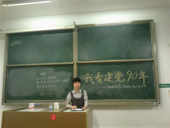 随后,生物师范班吴越发表了她的见解:中国共产党成立90周年来,面临了许多挑战也取得了许多成就。接着,地理班的龚琳针对中国共产党的成就谈了自己的感想,她谈到:纵观建党90周年,中国共产党为我们的生活作出了巨大的贡献。从之前的计划经济到市场经济,党切实的改善着我们的生活,这些益处是我们能够实实在在感受到的。同时,她结合家乡无锡的交通等方面的巨大变化来分析,相信在党执政的下一个90年,我们的生活一定会更美好。