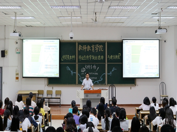 首先,恽老师开始了第一个话题“师范类本科毕业生升学就业选择的分析与建议”,他以往届毕业生就业数据为例,分析往届毕业生就业情况,针对一些专业对口却无法就业的例子,与同学们展开讨论,并分析原因,进而得出了就业选择应最先考虑是否适合自己,要在自己热爱的,并且适合自己的职业道路上全力以赴,不能半途而废的结论。