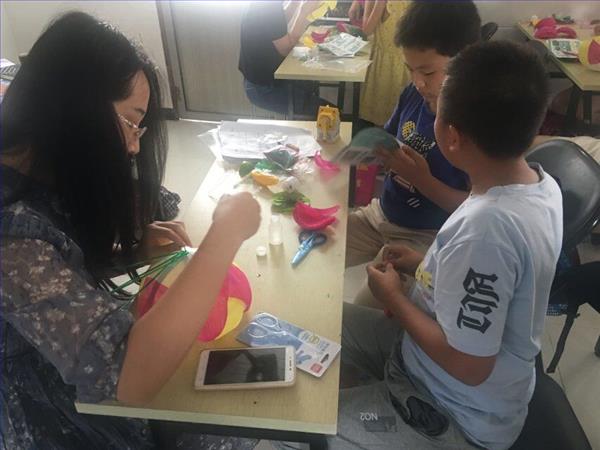 实践课由林怡老师带领大家做花灯,同学们分为六组,每组两人合作扎花灯,有一位老师协助,经过大家的努力,每一组都圆满完成了花灯制作,成品都十分精致,同学们也爱不释手。