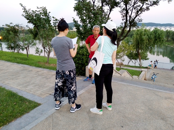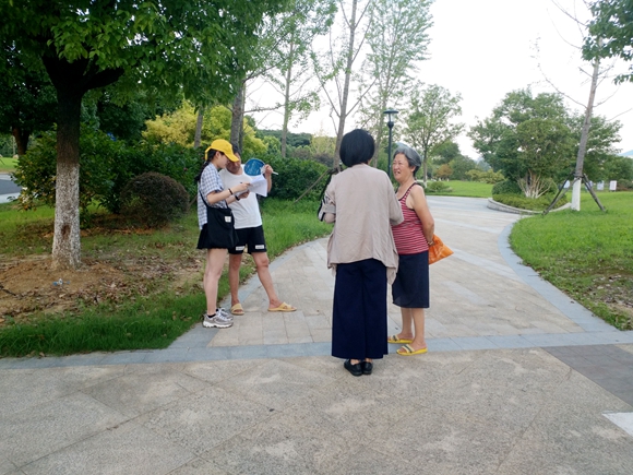 首先,姚凯博队长将十二人小队中半数成员调拨到问卷调研组,这六位同学自行结成一至三人小队,最后一共成立了三个问卷调研小组。接着,每位问卷调研组成员被分配到了不同的任务,每位成员带着领取的任务物品,即每人七张问卷与纸巾、糖果等礼品,分开行动。三个问卷调研小组分别到羊山湖公园、仙林新村、月苑小区等地展开行动,主要以三十岁以上的中老年群体为问卷发放对象,进行随机采访。发放问卷过程中,不少市民很快接受了小组成员填写问卷的请求,但另一方面,小组成员也遇到了比较多的困难——一个是许多人并不愿意接受填写问卷的请求,在小队成员几番询问之下仍直接拒绝;一个是许多中老年人由于不识字、眼睛看不清等原因没有办法自己填写问卷,于是小队成员就灵活应变,采取为接受问卷者念出问卷内容、向接受问卷者提问等方式,帮助接受问卷者填写问卷。最终,三个问卷调研小组都完成了队长分配的任务,取得了圆满的成功。其中,茆新一同学表示:“50岁以上的群体大部分对阿尔兹海默症不了解,特别是一些文化程度比较低的爷爷奶奶对于阿尔兹海默症的主要原因、预防措施等都表示不太清楚,可以看出她们获得相关信息的途径较少,甚至会出现错误认知。当我们提问大学生宣讲的意义时,她们表达了期待,尽管大学生群体的专业水平不如专业医师,但如果能够做到基础普及,能够提高人们对于该病症的认知。”