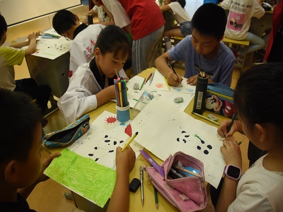第二节课是钱怡婷同学的“绘画课”。这节课教授学生们绘画的是国宝——熊猫。这群留守儿童们对熊猫都非常有兴趣,大胆尝试绘画,积极构思画作结构。以画作形式展现对国宝的喜爱,对祖国的热爱,对祖国千万事物的崇敬之情。