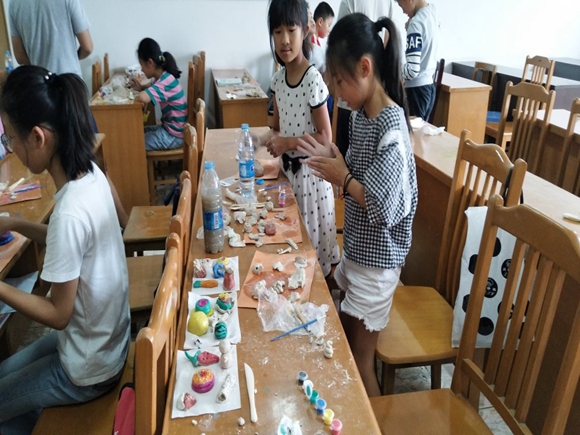 下午志愿者老师以《神笔马良》为引导,进行了木偶戏和布袋戏的介绍,印象尤其深刻的是霹雳布袋戏,视频中的表演十分炫酷,孩子们也看得津津有味。最精彩的是接下来的泥塑手工制作活动,在完成分发材料、分组后,大家都积极地投入到了自己的创作中。孩子们自发地选择了动物世界、人物冒险、甜点小店等主题,所有的志愿者老师都参与其中,大家也更加地积极,最后成品众多,摆了满满一桌,各具特色。其中有一个女孩特别认真,她的三层的小蛋糕十分精致,在颜料的渲染下,显得鲜亮诱人。动手的活动更容易调动孩子们的兴趣,也能锻炼孩子们的动手能力,看着孩子带笑而归,志愿者们也满是喜悦和欣慰。