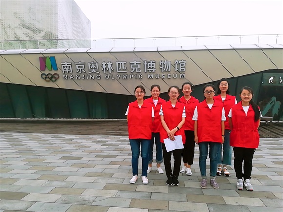 磅礴的大雨也无法阻挡大家的热情,讲解小队成员冒雨来到南京奥林匹克博物馆开始了暑期社会实践的第一天。实践活动分为三个部分,博物馆讲解员培训、馆内环境熟悉、工作分配。首先,在馆内讲解员的指导下,小队成员紧随其后,学习了解讲解内容及重点,体会讲解员所分享的与游客交流的经验,记录讲解时所需注意事项,之后还学习了经营纪念品店的有关工作。接着,小队成员在馆内自由熟悉环境,熟悉并实践培训内容。然后,为了便于进行后续的志愿讲解工作,两两分组。最后全体成员在奥林匹克博物馆门口合影留念。