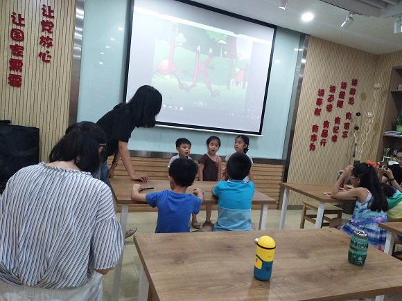 首先,由老师带着孩子们一起学唱英文字母歌。在进行了几遍教学之后,老师邀请了几组小朋友们去讲台上给大家表演唱歌。小朋友们都自告奋勇,积极举手参与。接着老师给出了几组由英文字母组成的简单动物图片给小朋友们来辨认,小朋友们思维敏捷,不仅看出了图片里的动物,并且找出了图片里暗藏的字母和词汇。后来,老师放了英文版小猪佩奇动画,小朋友们看的津津有味,在锻炼了英语听力的同时也认识了一些基础的英文表达方式。最后,大家玩了两个小游戏。一个是小朋友们在纸上用彩笔画出了想象中的房子,另一个是大家一起学习折千纸鹤。小朋友们在学习的同时,也活动实践了具体操作,收获颇丰。小队成员们给每个小朋友发了小蛋糕来奖励他们的精彩表现。今天的课堂活动到此结束。
