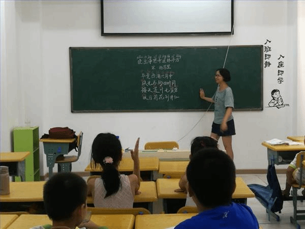 下午两点半,团队成员裘老师为同学们上了一节语文课。裘老师先把《晓出净慈寺送林子方》一诗抄写在了黑板上,并为认字不多的低年级同学们标注了拼音。先让同学们集体跟读了两遍,并为同学们解释了这首诗描绘的夏日美景、西湖风光,教了农历与公历的区别、诗歌题目的由来等知识,同学们听得十分认真。之后,裘老师先要求孩子们用三分钟时间默背诗歌最后两句,再将难度提升至三分钟内背诵全诗,给孩子们一点压力与挑战,孩子们也很配合。虽然有些孩子没能顺利完成课堂任务,但是大家都在积极参与尝试,至少都能将诗中的名句背诵了下来,激发了快速记忆的潜能,也算是一种自我突破了。