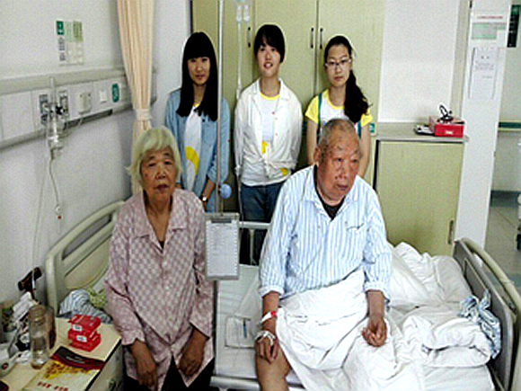 上午九点,队员们来到了无锡市一家医院看望住院的蒋才生爷爷。在队员们亲切的问候后,蒋爷爷热情地叙说起他的战争岁月。蒋爷爷16岁加入游击队参战,于1945年2月正式加入第3野战军4纵10师30团担任侦察兵。之后在战争中留下诸多伤痕,大腿内侧的疤痕是和日本人拼刺刀的时候留下的,而脑部的伤是在解放战争的孟良崮战役中留下的,现在是三级甲等残废。虽然受伤至今,但是回忆起那段历史,蒋爷爷在感伤的同时,也十分的激情昂扬,在场的队员们都受到极大地鼓舞。