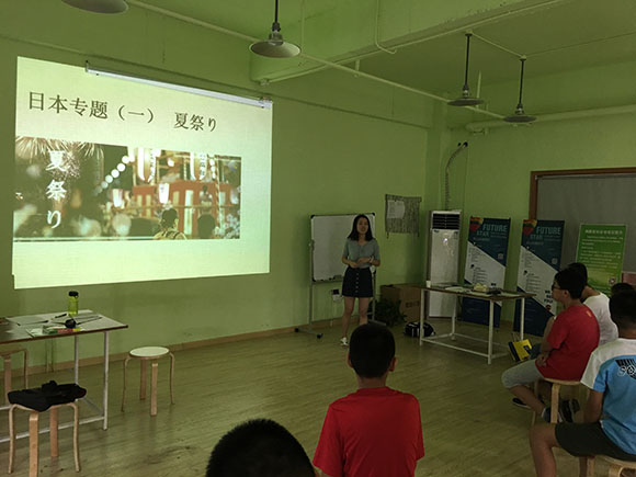 活动第二天,上海外国语大学日语专业大三学生王鲁川为学生对象带来《日本文化——夏日祭》主题文化课程。凭借其对于日本文化的独特理解,带领学生深入体悟“东瀛文化”。课程从日本独特的文化活动“夏日祭”入手,以点代面,反映日本民众真实的文化生活。同时,主讲人也结合大学所学知识,给同学们带来日语常用语教学。