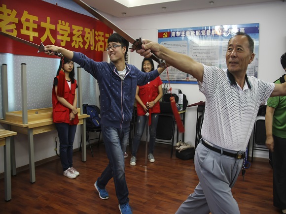 前三天的学习活动是“静态的”,而今天是“动态的”。老年人教小队成员舞剑、敲鼓,小队成员们教老年人跳现代舞健身操“小苹果”。爷爷奶奶舞剑时,出剑敏捷快速,眼神坚定有神,步履强健有力,身姿柔软轻盈,赢得小队队员们热烈的掌声,他们也迫不及待地学起来。不仅见识了舞剑,还学了敲鼓。