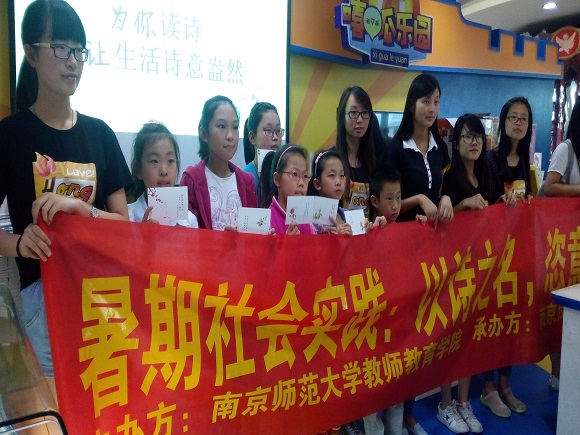 “红烛”青协的志愿者王诗文、李楚睿等八人来到凤凰书城,在4楼小舞台开展了“为你读诗——让生活诗意盎然”暑期实践活动。