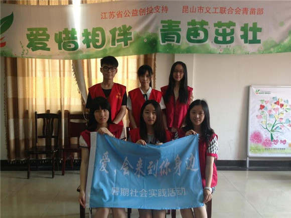 “爱会来到你身边”暑期社会实践团队在昆山市义工联合会的支持下,于昆山市富华社区活动室为58名孩子上了绘画、音乐课,顺利举办了此次青苗小课堂。
