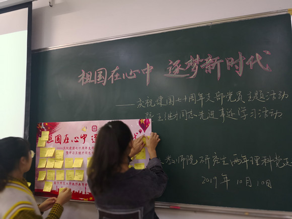 最后,党支部全体成员在便签纸上写下自己对祖国的深切祝福,并粘贴在展板上,用最真挚的感恩与祝愿献礼中华人民共和国成立七十周年。