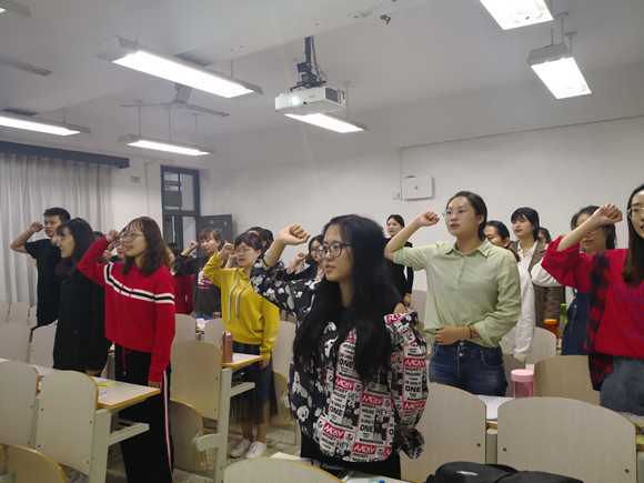 聆听汇报的同时,同学们也在先进党员王继才同志的感人事迹中受到鼓舞,明白作为一名党员应讲奉献、有作为,在今后的学习生活中以英雄前辈为榜样,不忘初心,砥砺前行。随后,在党支部副书记的带领下,全体党员举起右拳,庄严宣誓。声音嘹亮,回荡不息,体现了党员们对党忠诚的决心及为共产主义事业奋斗终身的理想信念。