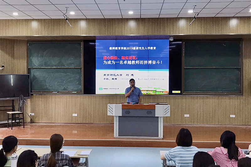 副院长、教授、博士生导师刘建老师以“虚心涵泳、踏实进取:为成为一名卓越教师而拼搏奋斗”为题,向全体2019级研究生新生开展入学教育讲座。