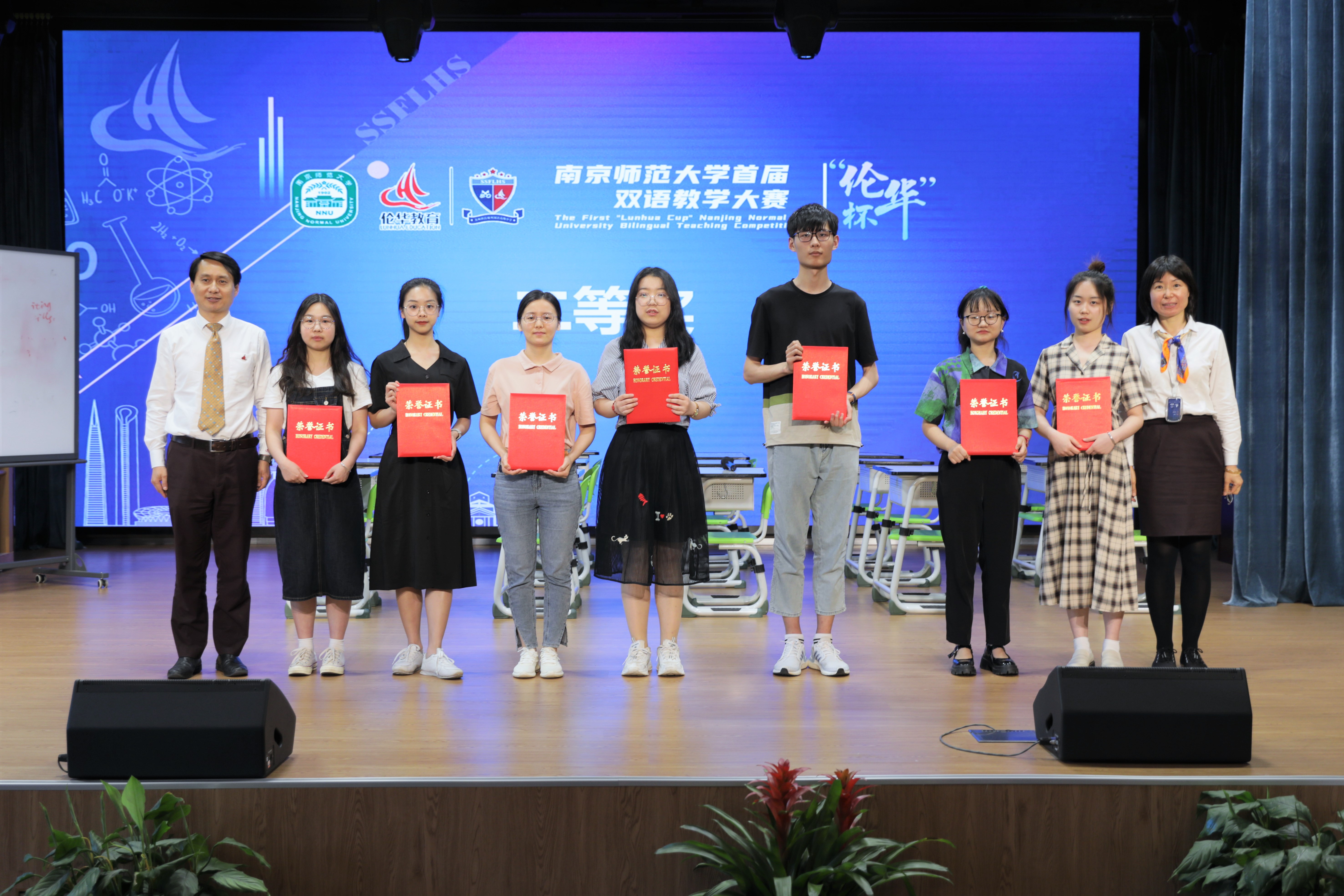 随后,首届“伦华杯”双语教学大赛正式开始。15位决赛选手都有自己的风格和特色,在比赛中使出了“看家本领”,课堂设计精心巧妙,令人眼前一亮、耳目一新。文科课堂条理清晰,极具亲和力;理科课堂直观新颖、深入浅出。短暂而精彩的八分钟课堂,充分展现了参赛选手们扎实的教学功底、过硬的教学技能以及流利的英语口语水平,得到了专家评委们的一致好评。大赛现场角逐激烈,精彩纷呈。苏科中的青年教师庞明伦在选手展示结束后为在场观众带来了一场双语示范课——《第三周期元素氧化物的酸碱性》,他以清晰的教学思路、生动的现场互动、有张力的课堂把控,展示了过硬的教学能力。最终,袁明逸、尹婧霞、俞嘉燕三位选手荣获特等奖;吴捷、朱婧涵、林冰玲、徐琬琳和江天琦5位选手荣获一等奖;陶璐、耿文青、姜南等7名选手获得二等奖;宋东丽、傅诗泉等22名选手获得三等奖。