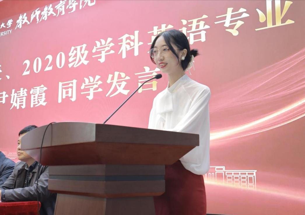 2020级卓越班学科教学(英语)专业的尹婧霞同学作为老生代表发言。她结合在青海省门源县支教的经历以及参加教师基本功大赛等获奖经验,亲切地鼓励学弟学妹们担负起时代责任,扬师德铸师魂,练师技强师能,树师表正师风,立志成长为卓越教师。