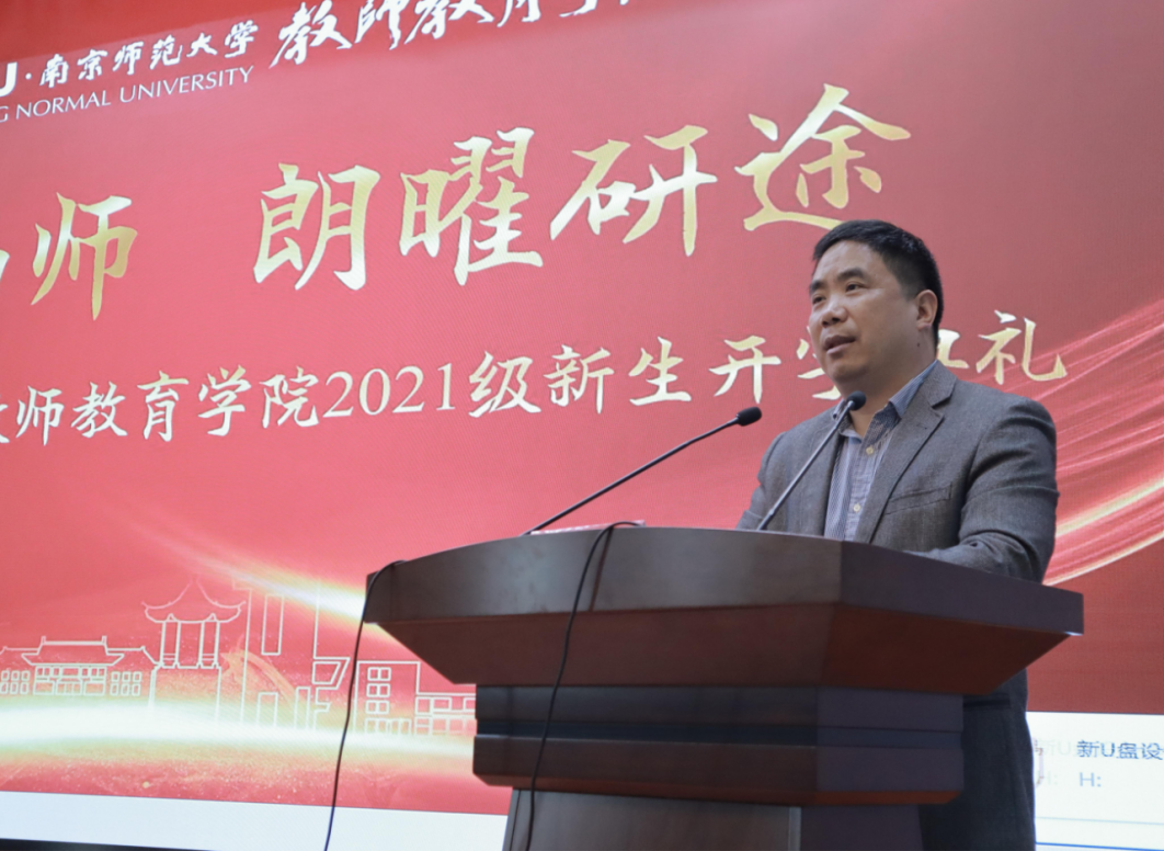 开学典礼在庄严的国歌声中拉开帷幕。院长叶忠教授代表学院向2021级研究生新生表示欢迎和祝贺。他向同学们介绍了我校卓越教师培养的基本情况,鼓励同学们肩负时代重任,不断提升素质,在求真中大胆质疑,在求新中谨守底线,在求业中恪守师德。