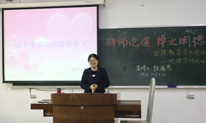 承办的“研师论道,博文明德”金陵教育学术论坛之地理学科论坛专题讲座在南师大仙林校区学海楼224教室顺利举行。本次讲座邀请到了江苏省中学一级教师、地理教研组长徐海燕老师,为教师院18级学科教学(地理)的全体研究生带来了主题为“做幸福的地理人”的讲座。