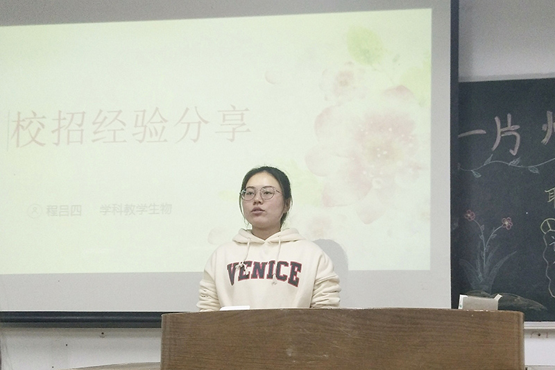 第三位程吕四学姐针对校招进行经验分享,从获得校招信息的途径、校招时间、校招形式以及考试相关等四个角度展开。大家可以通过班级群通知、班委分享获得相关资料,也可以通过一些个人途径,例如学校就业处、文武招聘网、华图教师招聘等。校招一般从10月中旬开始,以常州地区先,随后无锡、苏州、南京会陆续开始宣讲。学姐指出,在选择学校时不可太过心急而过早地签约。可以先去若干学校进行面试尝试积累经验。同时,学姐还分别从宣讲、网上报名和制作简历等几个方面对校招形式进行详细讲述并提出相关建议,列出了需要准备的文件。之后,她从笔试和面试两方面介绍考试内容,笔试以高考题为主,面试则包括无生上课、说课、讲解题目和结构化面试等形式。最后,学姐根据上述内容提出了几点建议,并耐心回答同学们的疑问。