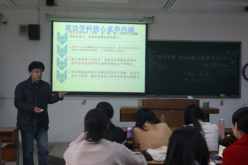 在核心素养理念的指导下,黄斌老师对学生们提出了一个问题:学习是什么?学习是一种外部加入的过程还是内部生成的过程?黄斌老师与学科教学(英语)研究生对这个问题进行了激烈的探讨。同时黄斌老师通过许多幽默风趣的例子讲解了核心素养内涵,分别从语言能力,文化品格,思维品质,学习能力进行了详细解读,并罗列出这四大核心素养各自表现的关键点以及对其对教师的要求。
