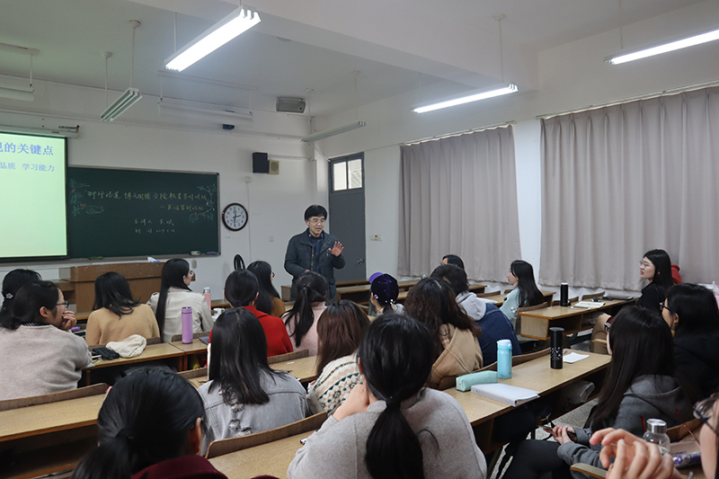 为了让同学们更好的应对今后就业,黄斌老师在结合核心素养理念和自身课堂教学实践经历之下,详细介绍了南京教师编制考试的现状,考试内容以及应对方式。除此之外,黄斌老师强调教学设计和教材解读的重要性,教学设计要明确行为主体,动词,条件和程度。教材解读三重点:更注重整体的理解,更注重自主的学习,更注重连贯的思维与表达。黄斌老师展示了优秀课堂的教学视频,亲自在现场展示了如何上好一节课,并与学生进行了亲密互动。